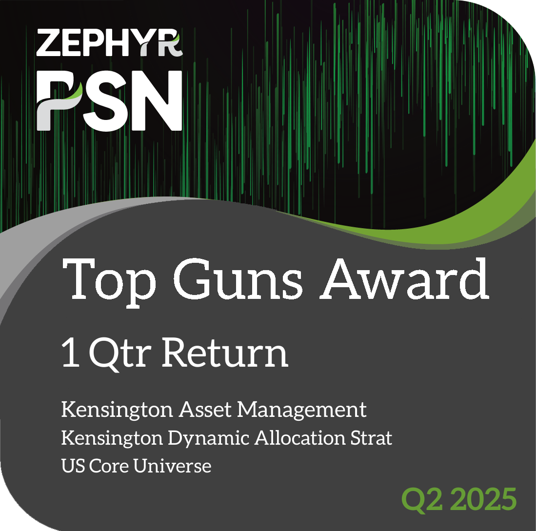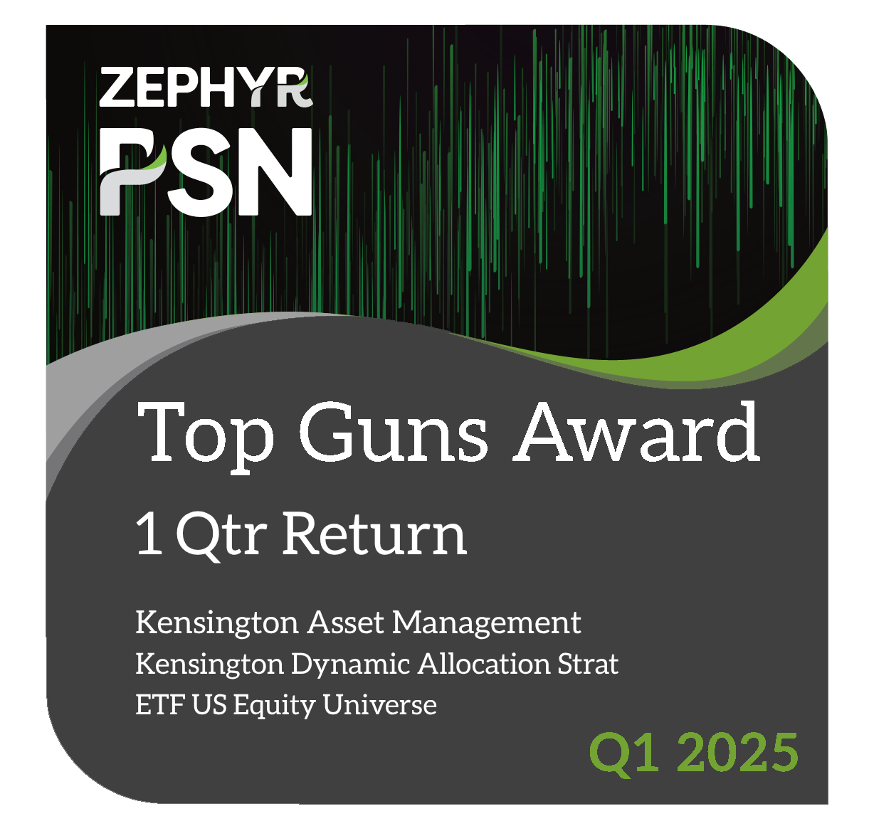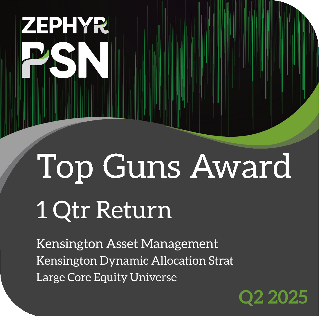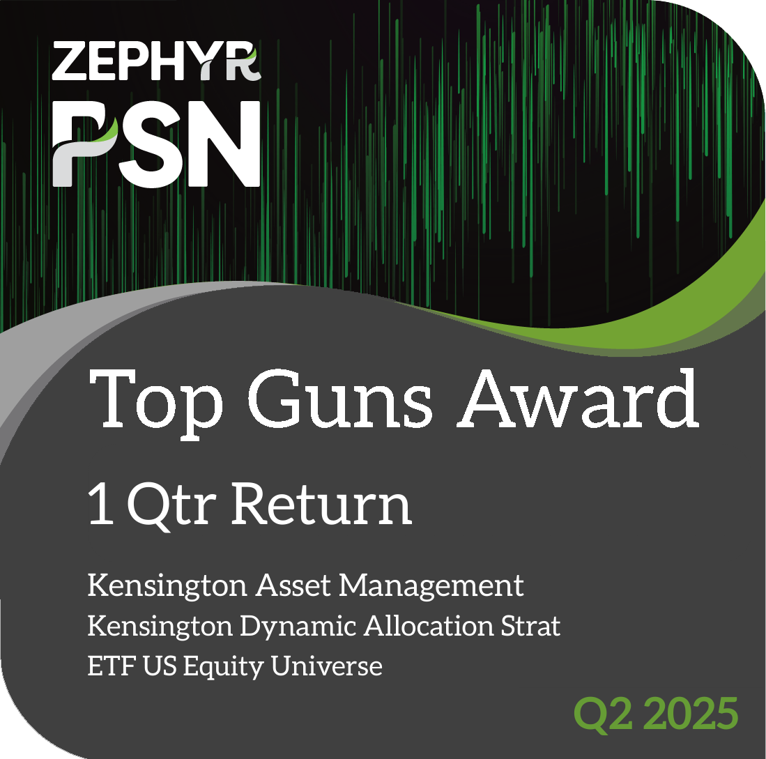 On May 19, 2025, the Kensington Dynamic Allocation Strategy was named to Zephyr’s “PSN Top Gun List” for Q1 2025, recognizing top-performing strategies in the ETF US Equity Universe which consists of 81 products offered through 40 Firms. 1 QTR CATEGORY: The peer groups were created using the information collected through the PSN investment manager questionnaire and uses only gross of fee returns. PSN Top Guns investment managers must claim that they are GIPs compliant. These top performers are strictly based on current quarter returns.