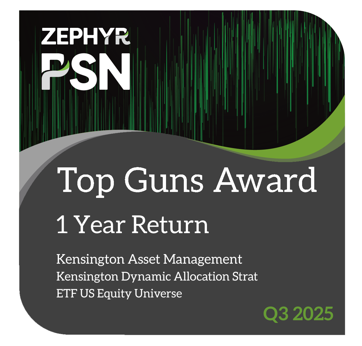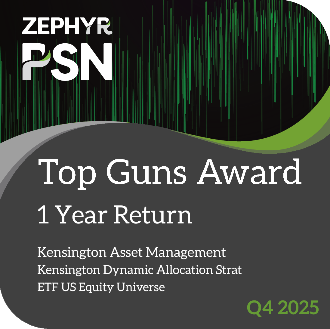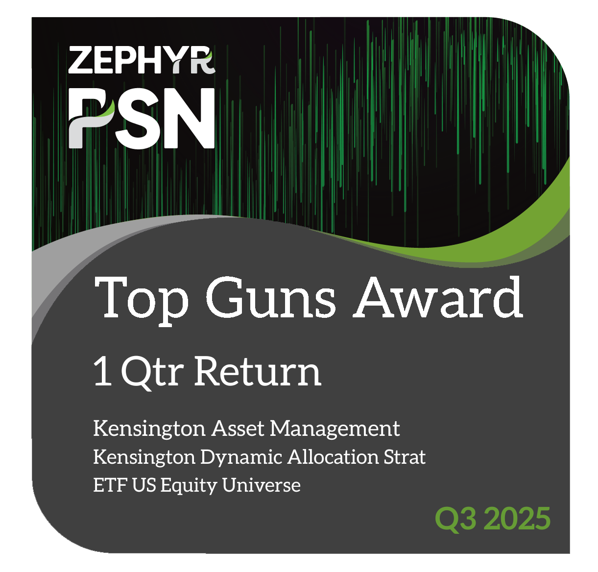 On May 19, 2025, the Kensington Dynamic Allocation Strategy was named to Zephyr’s “PSN Top Gun List” for Q1 2025, recognizing top-performing strategies in the ETF US Equity Universe which consists of 81 products offered through 40 Firms. 1 QTR CATEGORY: The peer groups were created using the information collected through the PSN investment manager questionnaire and uses only gross of fee returns. PSN Top Guns investment managers must claim that they are GIPs compliant. These top performers are strictly based on current quarter returns.