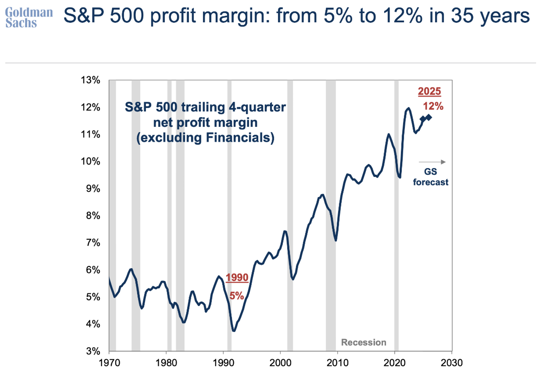 Breaking it down further, analysts are projecting S&P 500 revenue growth of 6.6% in 2026, a notable step up from this year’s estimated growth of 4.3%. At the same time, net profit margins are expected to reach record levels, extending the impressive long-term upward trend shown in the chart below. This combination of faster top-line growth and record margins leaves the market heavily reliant on continued strong execution to justify current valuations.