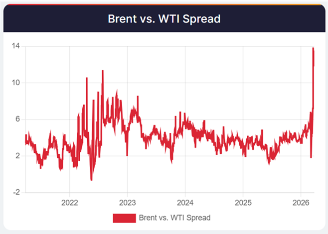 Oil was central to the market narrative. While both Brent and WTI moved sharply higher, Brent was the more important signal because it better reflected the supply disruption facing global markets. As the month progressed, the widening Brent-WTI spread highlighted the difference between global and domestic energy pricing pressure. At the peak of the move on March 31, that spread widened to $25 per barrel, highlighting the potential inflationary and economic considerations associated with higher global oil prices.