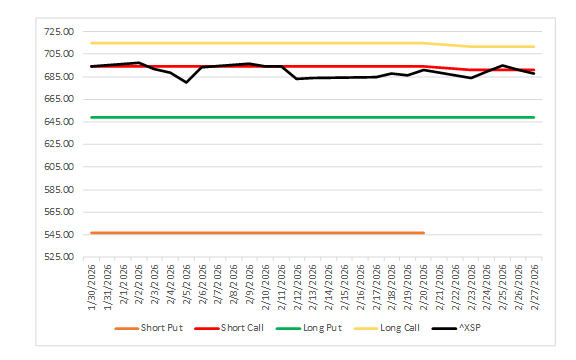Option premiums increased during the month, allowing the Strategy to generate approximately 1.52% in premium from the income-producing call spread. The call spread finished modestly above the Index at the expiration parameters, and the downside hedge finished below the Index. As an update, the short side of the downside buffer was closed on February 20 after it no longer offered sufficient value to offset the risk, resulting in the Strategy finishing the month with a defined floor rather than a buffer. Both option positions are scheduled to expire on March 20.